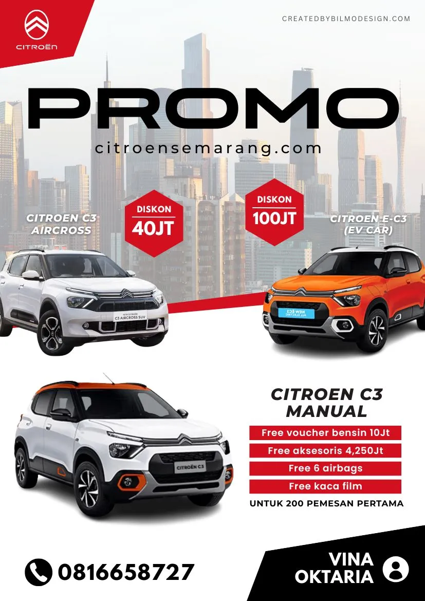 Selamat datang di website resmi Citroen Semarang. Dealer resmi dengan layanan penjualan, service dan sparepart terbaik di Indonesia. Layanan konsultasi online 24 jam dengan seorang Car Adviser terbaik dan memberikan solusi untuk mobil impian anda & keluarga tercinta anda.